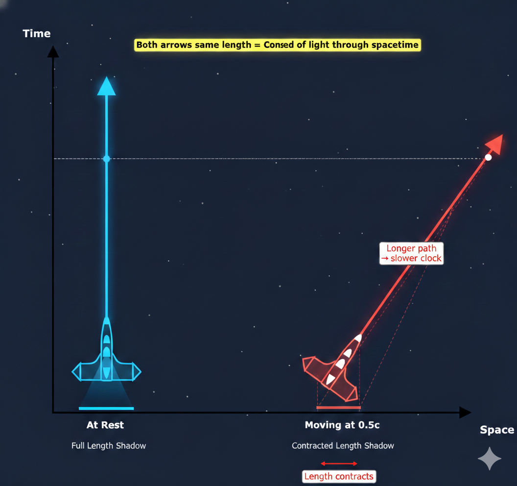 Here’s the diagram. On the left, the plane is at rest, with all its velocity pointing through time. On the right, it’s moving through space, so its velocity arrow tilts. The arrow length stays the same (speed of light through spacetime), but now it’s split between space and time directions. The dashed lines show how its spatial extent appears contracted when you project it onto the space axis.